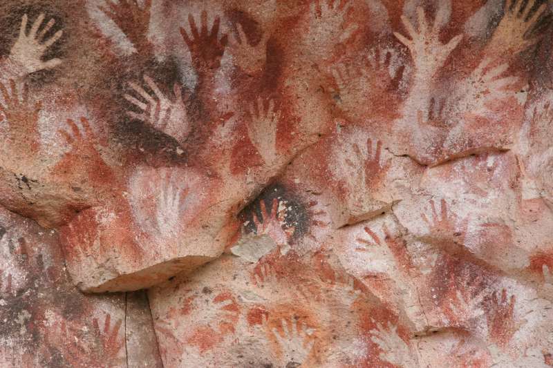 the paintings from patagonian cavemen almost 12,000 years ago were immaculately preserved in the porous rock. a guide took us on a path around the cave, explaining the three different styles of pictures and the phases they represented. most of them were hand silhouttes belonging to men and women (deteremined by relative width vs length), from young and old (the big ones were very big) and one even had 6 fingers. he suggested that the pictures may have predated spoken language, the hunting scenes of men and guanaco perhaps used to explain strategies amongst comrades. on the opposite side of the canyon to the cave, three paths led from the higher plains down to the river below. these natural paths were used by guanaco when they got thirsty after a day’s grazing and here they would be surrounded by cavemen and attacked with spears and rocks on leather ropes. it was very cool to be standing outside a real caveman’s cave, the ceiling still blackened from the smoke of their fires, guanaco bones and small obsidian flints still littered around what was once their winter refuge.