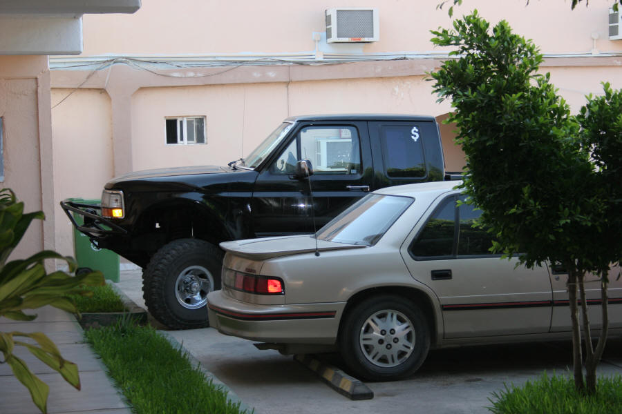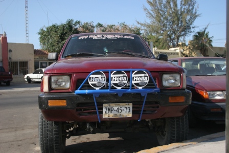 in much the same way that mtv culture has influenced the way the youth dress in the developing world, the wealthier mexicans have embraced the all-american bigger is better attitude to their motors, and then added their own dash of off-road spice. drive our raised toyota around traffic in london and you smugly look down on bmw X5s and mercedes m-classes; the only thing that blocks your line of sight is a truck or bus. in southern baja california we're just another motor. yes we have the bull bar, the fog lights, the big white letters on the sides of our wheels etc. but so does everyone else - supersized. they tint ALL the windows including the front windscreen, they have REAR bull bars (backing it up), they sport wheels which would look more appropriate on a 747... and in the evenings, while they repeatedly do the block, the subwoofers blast bass lines to not hip hop but to latin music, sometimes jazz...